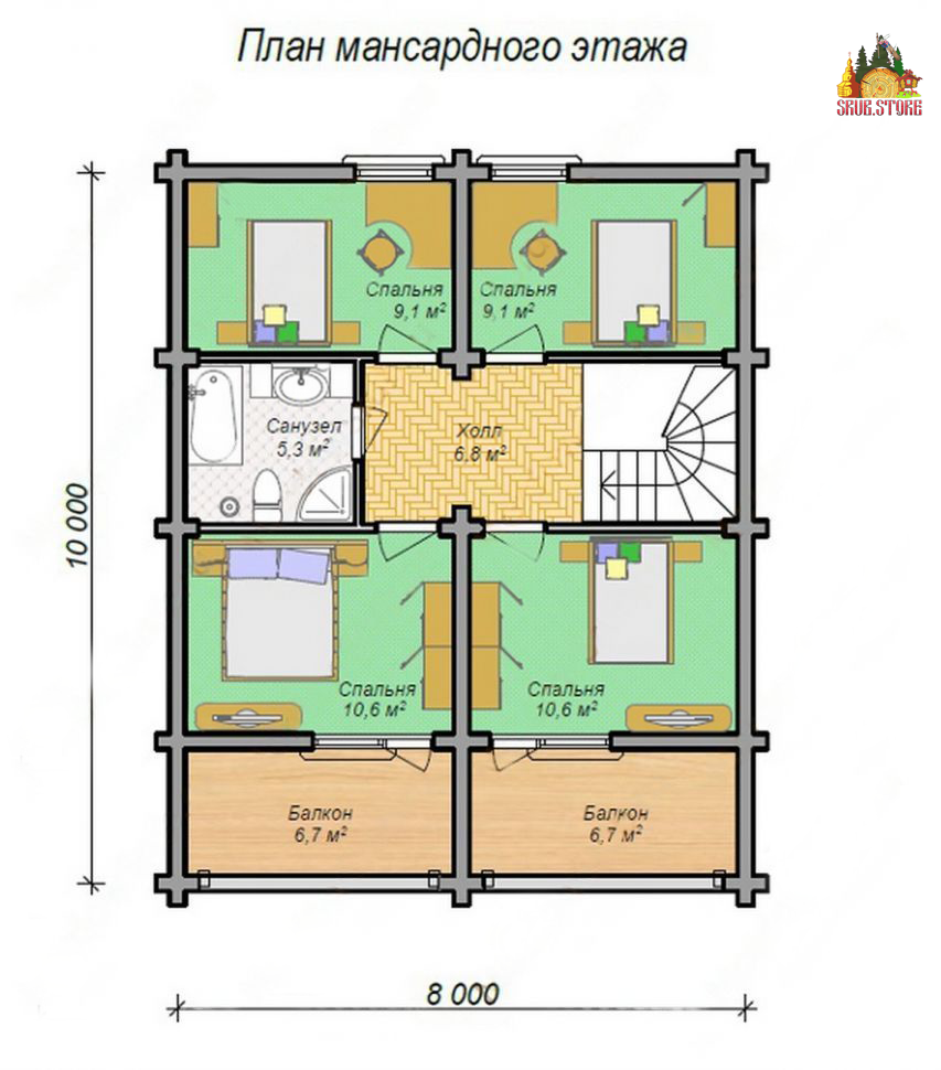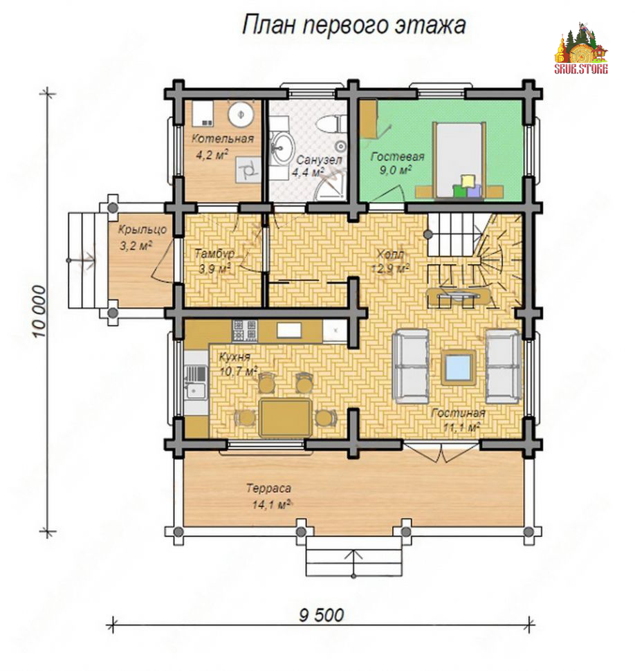 Сборка здания производится из предварительно обработанного и подготовленного бревна, благодаря чему красивый и вместительный дом будет готов за короткий срок времени. Проектные размеры строения составляют 9,5х10 м. По желанию заказчика габариты, этажность, компоновка комнат и другие параметры могут быть изменены.