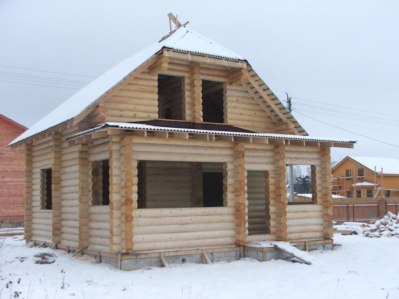 Сруб дома с мансардой 74,4 м2 изготовлен из бревна. Состоит из трех частей: