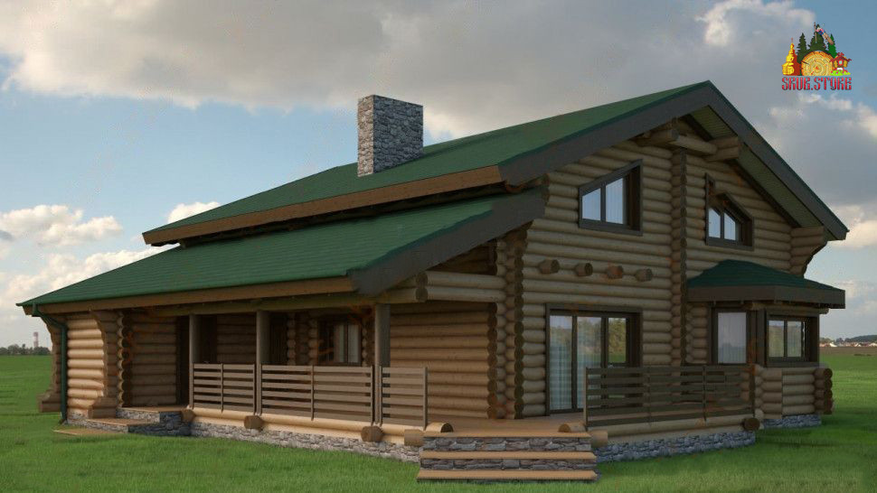 Сруб гостиницы 313,4 м² (5 номеров) отличается окнами разнообразной формы и размеров. Один из фасадов смотрится особенно оригинально благодаря выступу стены (архитектурный элемент "ризалит"), который дополняет столовую первого этажа. Её площадь увеличивается, а перед гостями открывается прекрасный вид на природу.