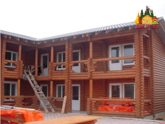 Сруб гостиницы, рассчитанной на 10 номеров, имеет площадь 270 кв. м. Каждый блок имеет отдельный выход на общую террасу. Герметичные соединения бревен в сочетании с качественными утеплителями позволяют добиться минимального уровня теплопроводности конструкции. Стены обеспечивают качественную шумоизоляцию во всех помещениях.