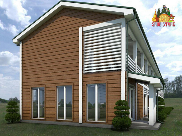 Большой сруб современной гостиницы в европейском стиле отличается лаконичностью стильных фасадов, контрастным оформлением ограждений балконов. Объект площадью 765 кв. м рассчитан на 24 номера, имеет продуманную планировку. Входы в комнаты расположены на общей террасе. В каждом номере предусмотрено наличие индивидуального санузла. Детали планировки могут изменяться по желанию заказчика.