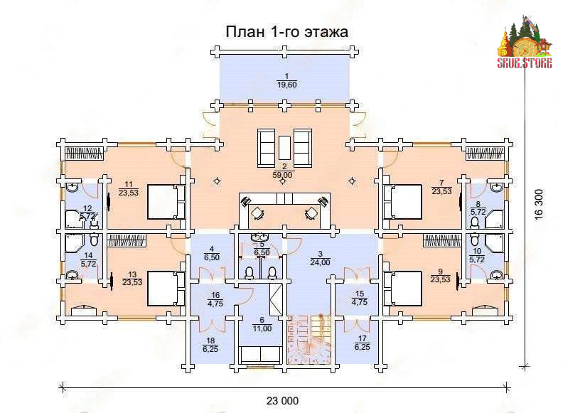 Красивое двухэтажное здание с террасой отличается эффектными линиями. Сруб «Премьер Отель» (8 номеров) состоит из главного корпуса и двух боковых, симметричных. Номера на первом этаже равны по площади: 4 спальни по 23,5 м². Центр второго этажа занимает просторная гостиная с бильярдной. Здесь в двух номерах спальни также по 23,5 м², а ещё в двух — по 26,4 м².