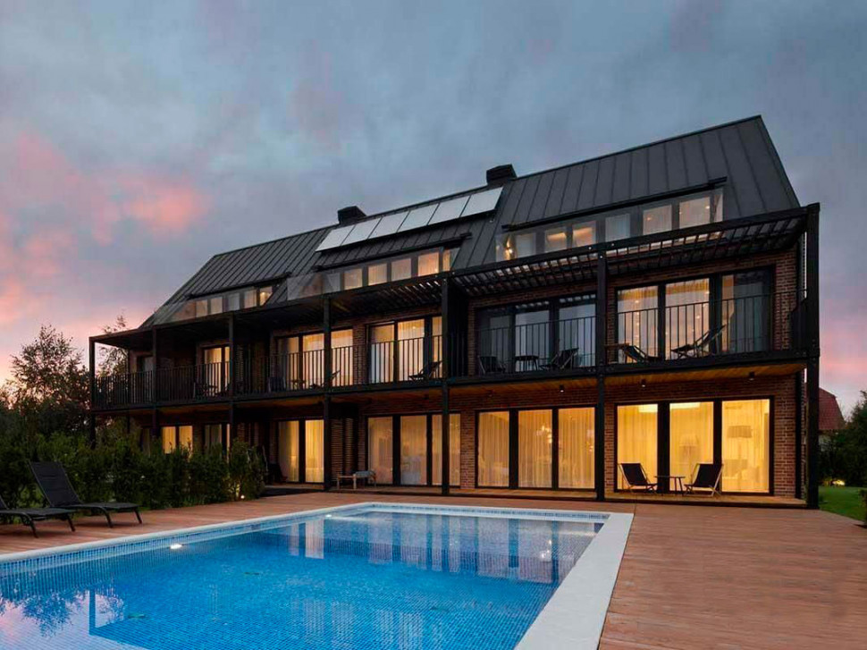 Проект мини-отеля на 14 номеров, три этажа плюс нулевой (подвальный). Площадь застройки 450 м2. Первый этаж - 299.9 м2, Второй – 296.5 м2. Подвал – 72 м2. Общая площадь 789 м2. Отель представляет из себя современное функциональное здание, включающее 14 номеров на 2-3 человека и несколько семейных. Из каждого номера выход на балкон или террасу. На первом этажа расположена обеденная зона – ресторан. В подвале котельная подсобные помещения. Конструкция разработана для эксплуатации в сейсмоактивных зонах. Наружная отделка выполнена под кирпич, в английском стиле.
