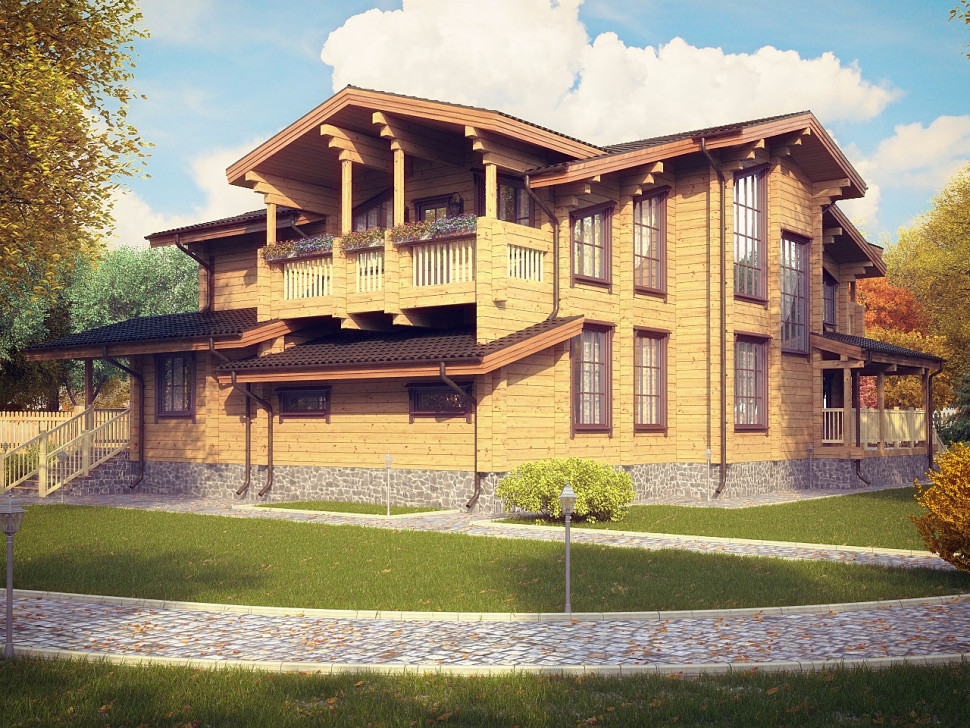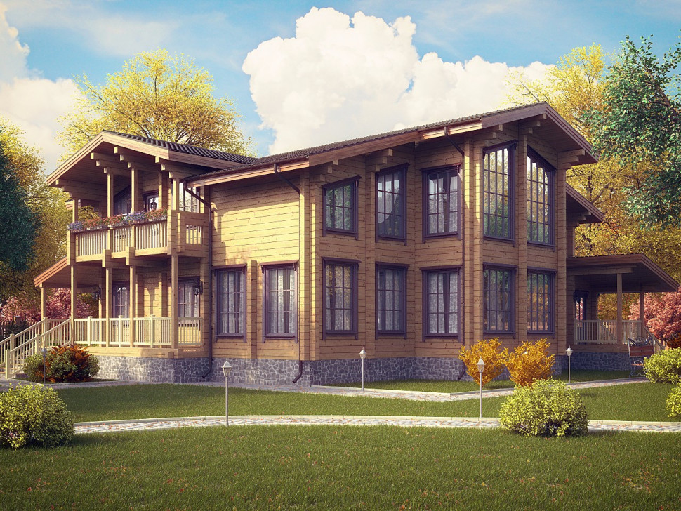 Сохранив во внешней отделке естественные цвета натурального дерева, архитекторы подчеркнули сходство дома со старинной русской усадьбой, напоминающей сказочный терем. Вместе с тем, высокие элегантные окна с мелкой расстекловкой и наличие эркера создают аллюзию на типичные европейские коттеджи.